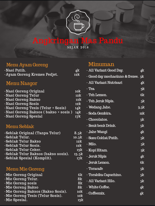 Angkringan Mas Pandu, nestled in the heart of Semarang at Jl. Wismasari V No.5, offers a vibrant culinary escape rooted in authentic Indonesian street food. This café’s menu is a celebration of bold flavors and comforting classics, perfect for casual dining or relaxed hangouts.